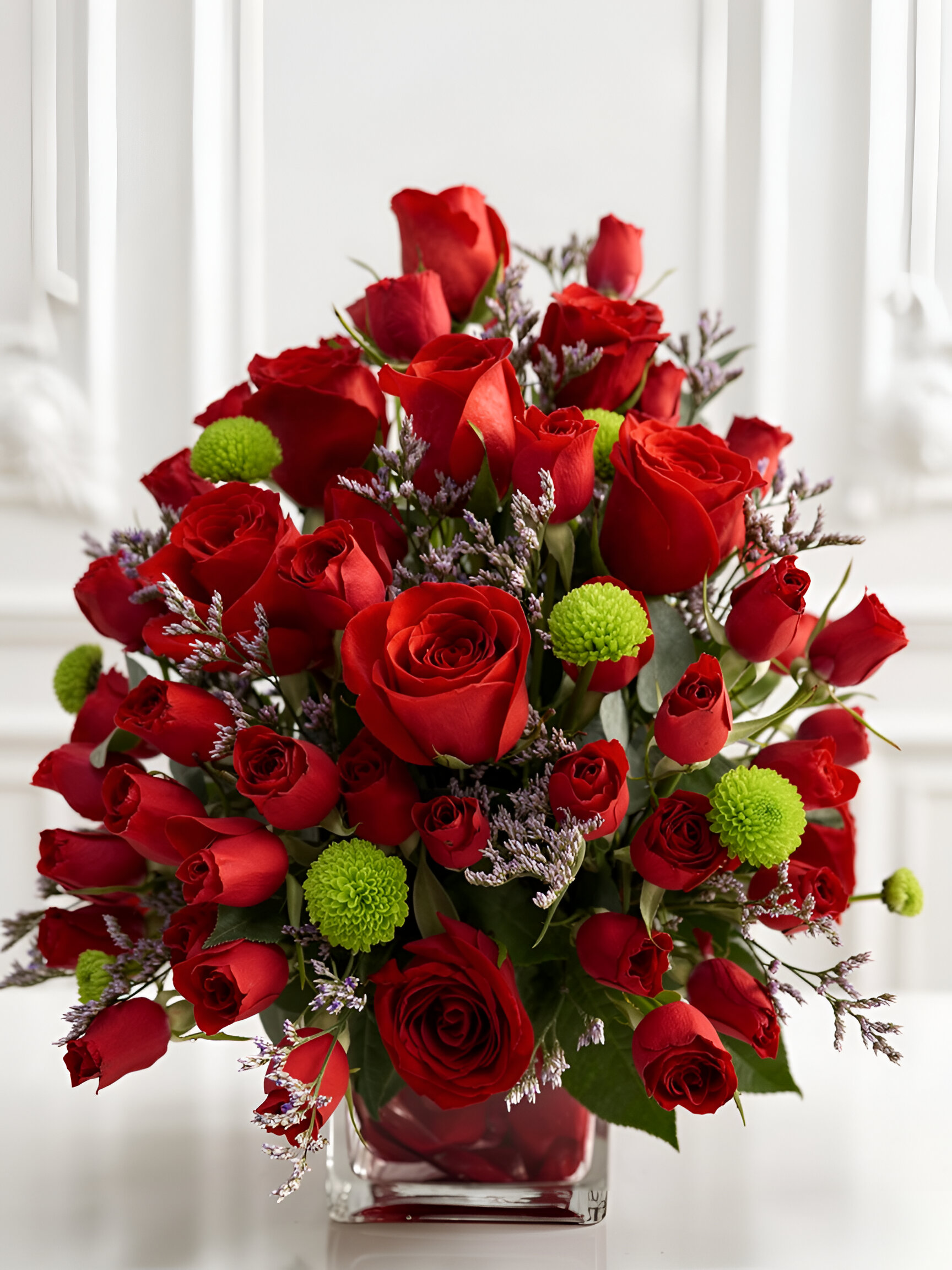 فازة قزازية أنيقة تحتضن ورودًا طبيعية حمراء تنبض بالفخامة والرومانسية.