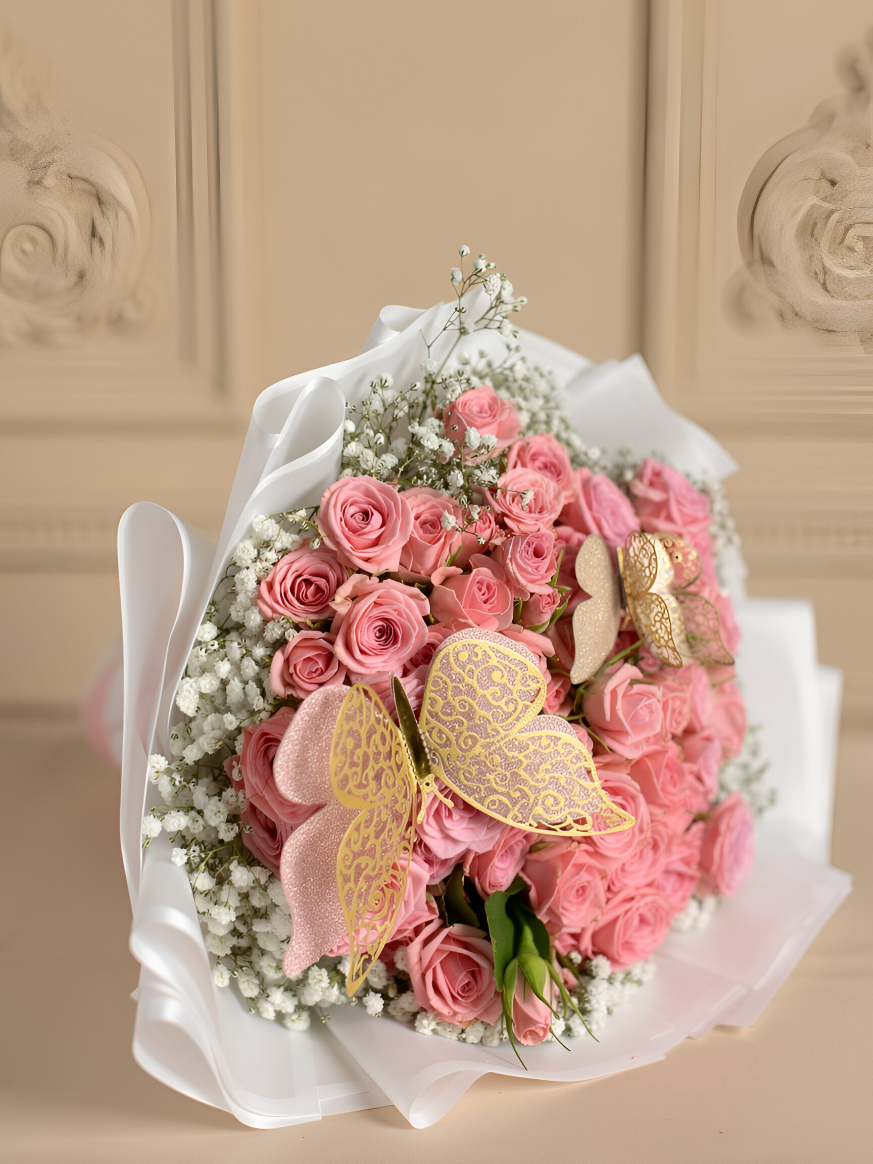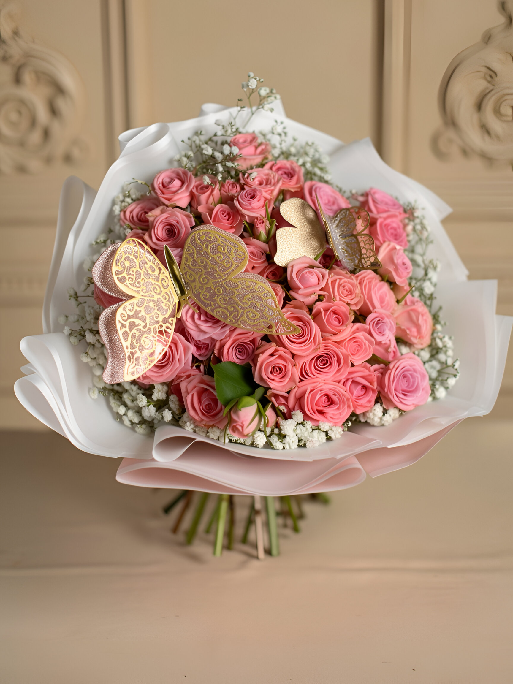 باقة ورد باللون الزهري الفخم، تنبض بالرقة والأنوثة، منسقة بعناية لتجسد الذوق الراقي والمشاعر الراقية.