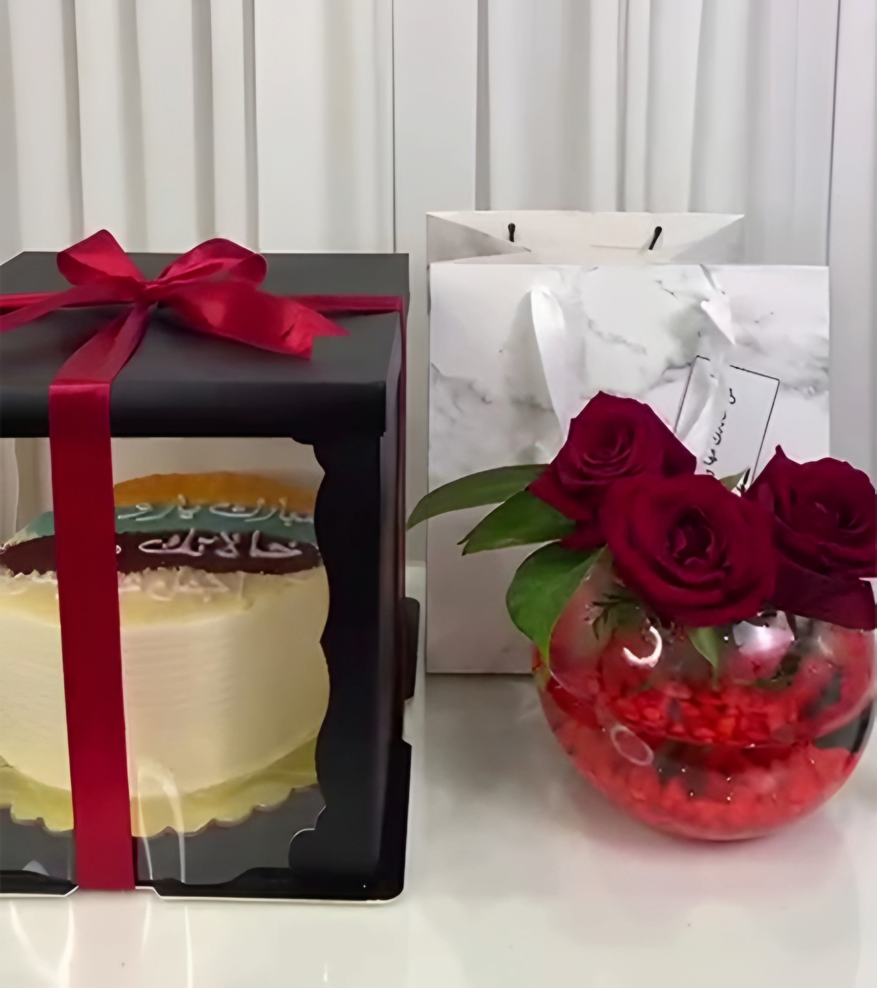 مجموعة الهدايا الملكية: كيك، ورد، وفازة زينة