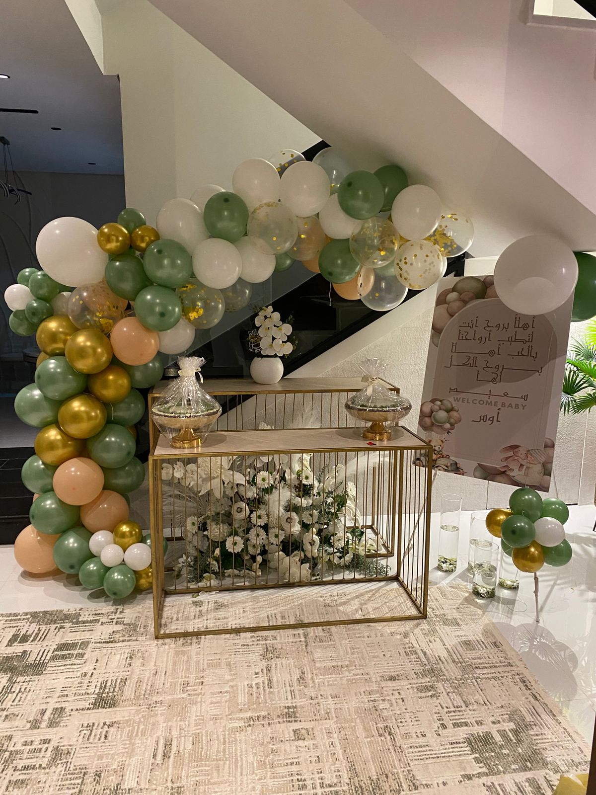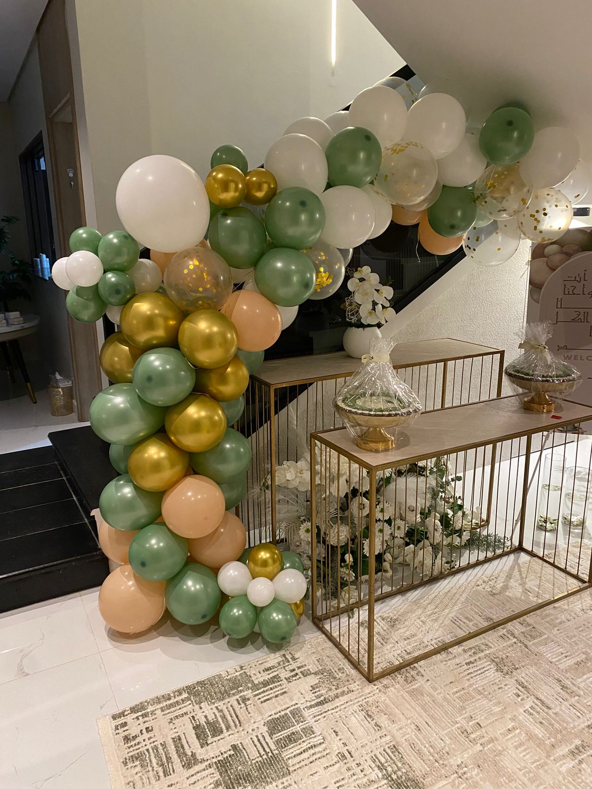أضيفي طابعاً احتفالياً أنيقاً لمدخل منزلك أو منطقة الاستقبال مع هذا القوس المميز. بتصميم انسيابي يجمع بين ألوان الطبيعة الهادئة وبريق الذهب، ليصنع خلفية مثالية للتصوير والترحيب بضيوفك.