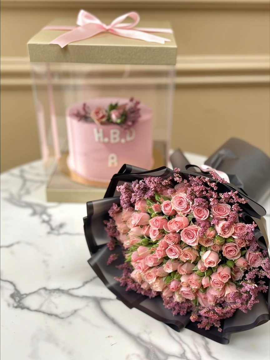 تأتي مع كيكة أنيقة داخل صندوق شفاف لتكمل جمال الهدية وتحوّل اللحظة إلى ذكرى لا تُنسى.