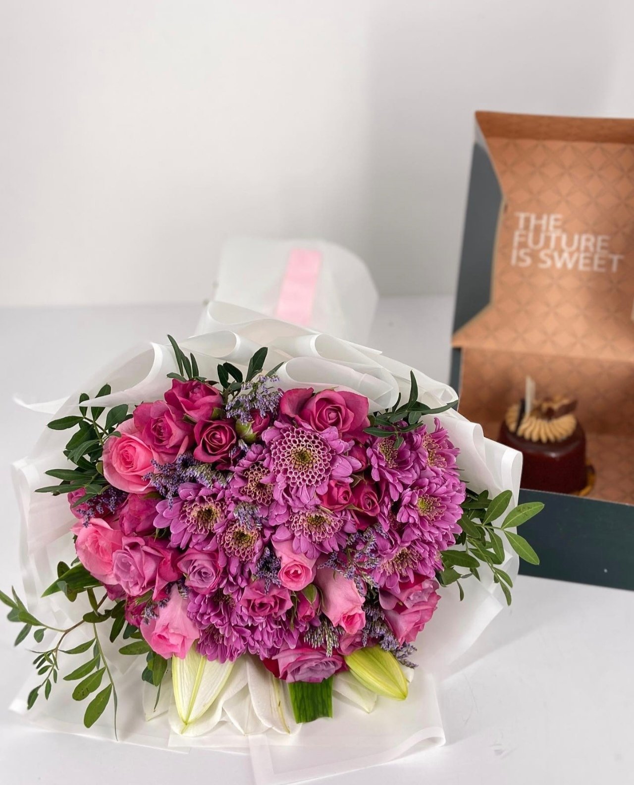باقة من الورود الطبيعية يصاحبها ميني كيك