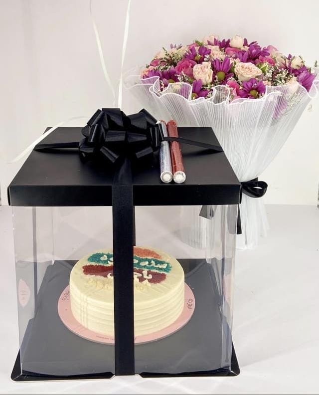 باقة ورد مع كيك من منش موضوعة في بوكس الهدايا