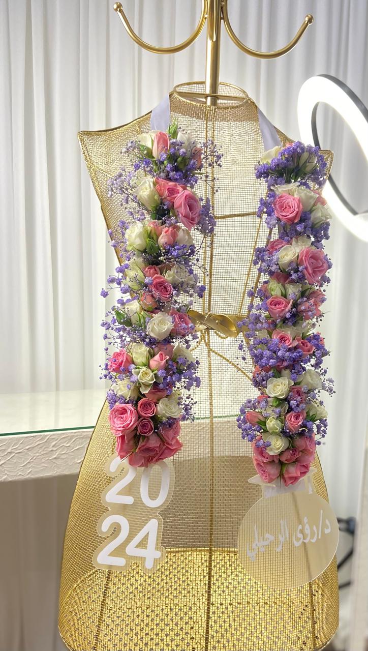 عقد ورد طبيعي بألوان زاهية، يُخصّص باسم الخريجة وسنة التخرج — تذكار أنيق ليوم لا يُنسى."