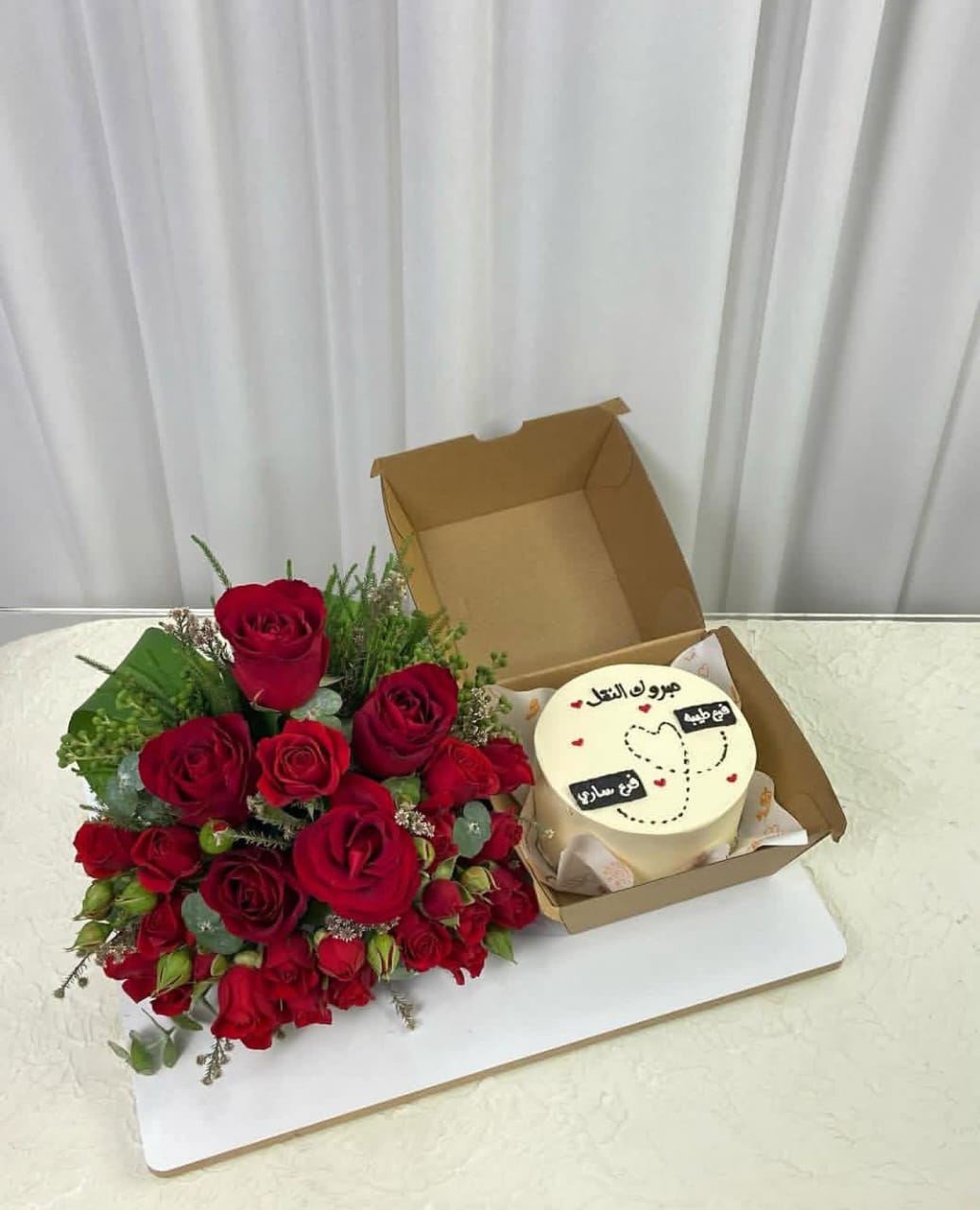 لنش كيك مع ورد طبيعي مزينين على قاعدة مع الكتابة على الكيك